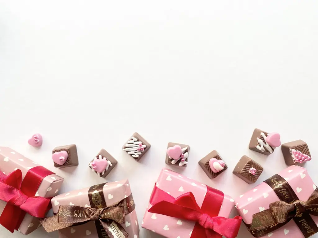 使用したプロンプト: 「バレンタインのシンプルな背景 写真風 文字を入れるため上部に余白を作って チョコレートの写真を入れて」